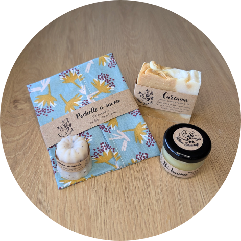 Ingrédients : huile de noyaux d’abricot, beurre de karité, beurre de coco, beurre de cacao, huile de ricin, poudre de curcuma.